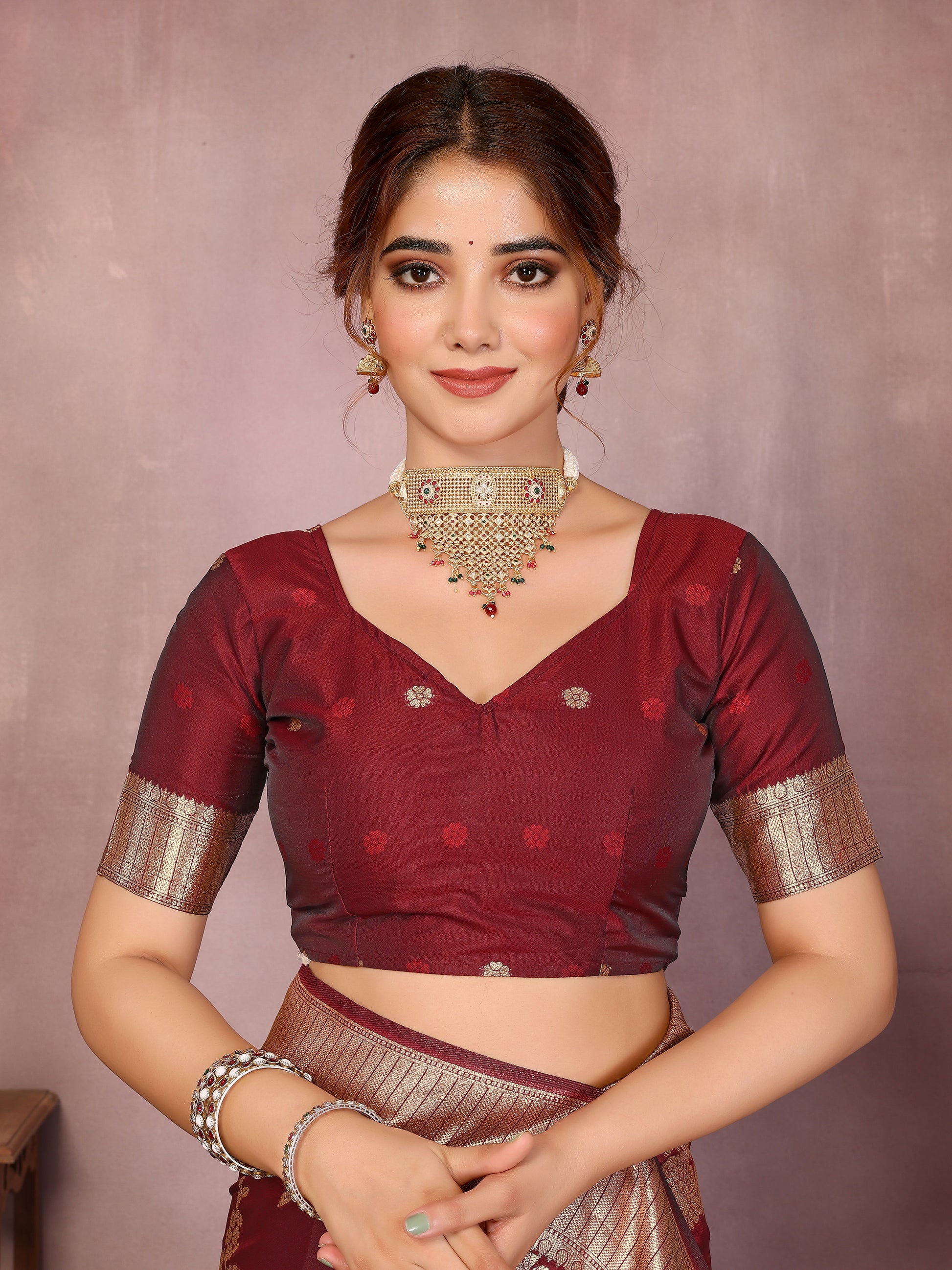 Crafted from premium Banarasi silk, the saree features an intricate woven design inspired by traditional Kanjeevaram artistry. The deep maroon shade enhances its luxurious appeal, making it a graceful choice for special events. The fabric drapes beautifully, offering both comfort and a refined finish.